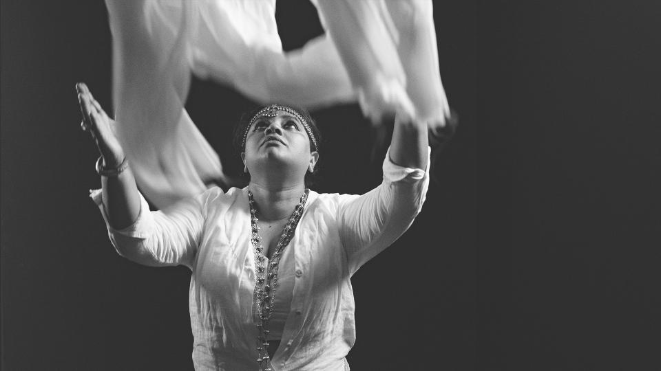 The second segment is a performance art piece featuring live music by Tsoof Baras (drums), Daniel Philippe (piano), and Menaka Thomas (vocals) with choreography from Mohiniattam dancer Bindu Rajendren.